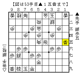 実戦は▲1五香以下△6二銀▲5五飛△同歩▲8二角成△1五香▲1三角で、ソフトの評価値+371で先手有利。