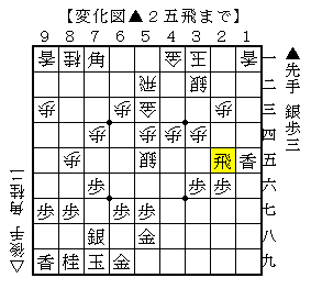 △5五銀には▲1五香があったようで△4四歩に▲2五飛と逃げる展開です。