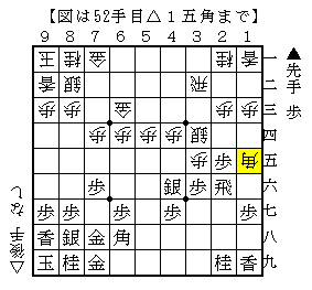本譜は▲6八角△3四銀▲3六歩△1五角で、ソフトの評価値+233で互角。