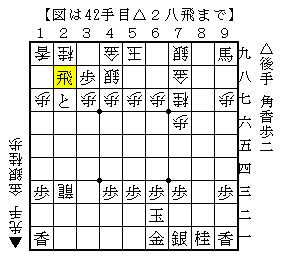 以下△3八歩▲4八銀に△2八飛としたのですが、後手の攻めはやや遅いような感じがします。
