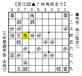 ▲7四角成以下△同玉▲5二角成△6五玉▲6六金△同玉▲6七金打△6五玉▲7七桂まで。