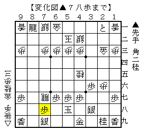 ▲7八歩では▲6八角や▲8八角もありますが、真ん中の局面図と似たような形で比較しています。