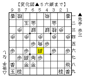 後手の角が狭いので△6五歩と突き捨ててから△4一飛と回って飛車を4筋から動く狙いに▲5六銀としてどうかという展開です。
