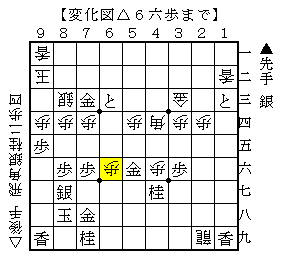実戦は△6五歩以下▲同金△5八飛▲9五歩△7七銀で、ソフトの評価値-99980で後手勝勢。