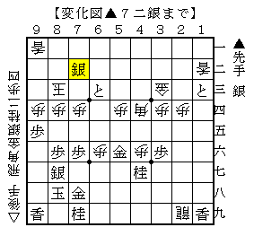 また△7七銀に▲9七玉は△8八角▲9八玉△9九角成▲同玉△9七香▲9八角△同香成▲同玉△7八飛成▲同銀△8八金▲9七玉△8五桂▲同歩△8六角▲9六玉△9五歩まで。