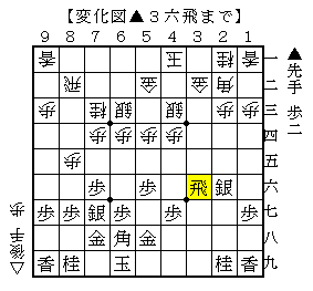 よって△3六歩に▲3八飛として以下▲3六飛として歩を取る展開です。