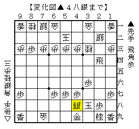 ▲4八銀に△7七角なら▲8二歩成△同銀▲8七飛△8六銀▲8四飛で、ソフトの評価値+216で互角。