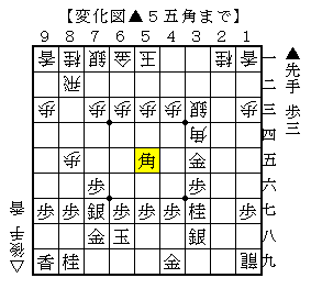 この手順は、2九の桂馬が跳ねたことで歩の成り捨てから△2九飛と打たれますが、▲3八銀から▲5五角と打ってどうかという展開です。