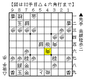 実戦は、▲1二馬△同香▲4五飛△4六角打で、ソフトの評価値-1132で後手優勢。