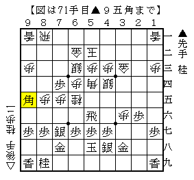 ▲9五角以下△9四歩▲6二角成△同玉▲7三金△5二玉▲5五桂△7二銀▲同金△同角▲7三歩成△4五角で、ソフトの評価値-939で後手優勢。