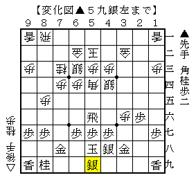 ▲5九銀左とした局面は先手から手を作って攻めるのは難しそうなので、後手に動いてもらうしかない感じです。