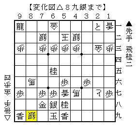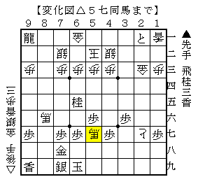 ▲5九香以下△5七桂不成▲同香△同馬で、ソフトの評価値-1909で後手優勢。