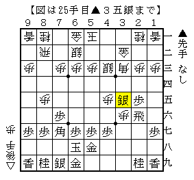 ▲3五歩の仕掛けに後手が△同歩と取れば▲4六銀と上がりますが、実戦もそのように進みました。