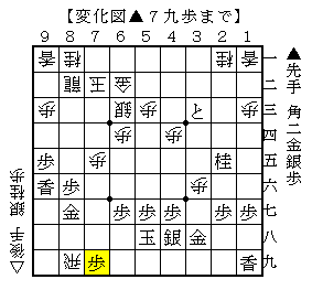 実戦は、△8四歩以下▲9八香△2二飛▲8八玉△4二角▲7八金上で、ソフトの評価値-12で互角。