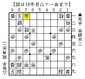 実戦は△7二金以下▲6四銀△6三金▲同銀成△6八と▲同金引△7一金で、ソフトの評価値+95で互角。