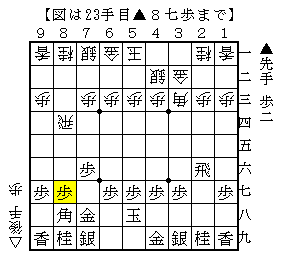 通常の横歩取り△3三角型は、後手は2筋に歩を使っていないのが多く、この局面は△2三歩と打って持ち駒の歩が1枚しかないので、少し損をしていると思っていたのですが、あまり影響はないようです。