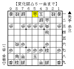 ▲3六歩△4一玉▲3七桂△5一金で、ソフトの評価値+61で互角。