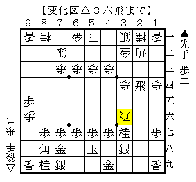 この手順は▲8七歩と穏やかに指した手に実戦は△8五飛だったのですが、ここでは△3六飛もあったようです。