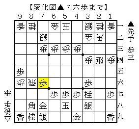 ▲7六歩に△同飛なら▲2二角成△同銀▲6五角△8六飛▲8七歩△2三歩▲3四飛△3三歩▲4四飛で、ソフトの評価値+696で先手有利。