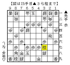 この手順は、▲3六歩から▲3七桂とする手で、▲3六歩はソフトの候補手にはありましたが推奨手ではありませんでした。