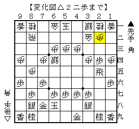 △2二歩では△2二銀のような受け方もありますが、いつでも▲2三角と打つような筋があるので指しづらいです。