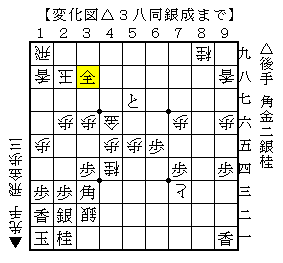 △3八同銀成以下▲同玉△4八金▲2八玉△2七金で、ソフトの評価値-99990で後手勝勢。