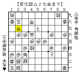 先手は受けても仕方ないということで半分形づくりみたいな手ですが、先手に斜めの駒が入ると▲2一銀成から後手玉が詰む形です。