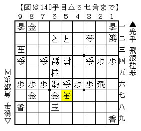 △5七角の前は▲8一金と飛車を取った形なので、気分的には多分先手が勝ちだろうと思っていました。