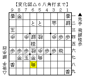 △6八角打以下▲同金△同角成▲同玉△5七銀で、ソフトの評価値-99994で後手勝勢。