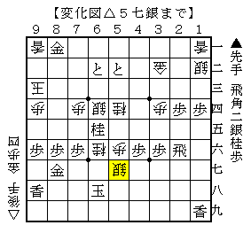 上図は、角換わりからの進展で△5七角と打った局面。ソフトの評価値+5003で先手勝勢。
