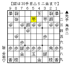 この手順は▲3四歩に△2二銀と壁銀で辛抱したのですが、▲4五桂から▲5五角打が厳しく先手優勢です。