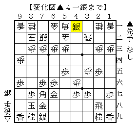 ▲4一銀以下△3一飛▲5二銀成△同金▲4六歩△3六歩▲2七飛で、ソフトの評価値+173で互角。
