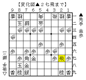 この手順は金と銀の交換から▲4六歩と手を戻しますが、そこで△3六歩に▲2七飛という展開です。