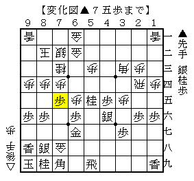 ▲7五歩に△同歩なら▲8七銀打△7九金▲同飛で、ソフトの評価値+273で互角。