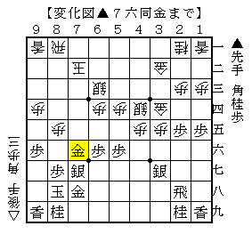 ただし本譜は、▲7六同金とする形で、金が4段目に出るのが盲点です。