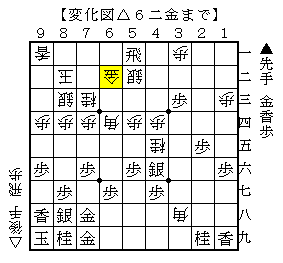 ▲3三歩△4三銀▲5二龍△同銀▲5一飛△6二金で、ソフトの評価値+1416で先手優勢。