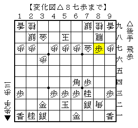 △8七歩に▲同金なら△8一飛▲7七金△8五歩▲8三歩△同銀で、ソフトの評価値-533で後手有利。