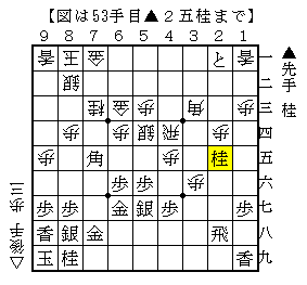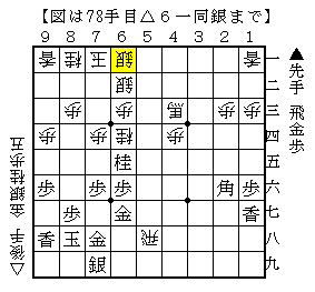 実戦は△6五桂以下▲8八銀△8六歩▲同歩△同飛▲6六歩△8八飛成▲同金△3九銀で、ソフトの評価値+155で互角。