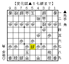 先手は▲4八金と上がった金を▲5八金としているので1手損になっていますが、後手の仕掛けを封じる意味です。