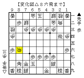 以下先手は2筋の歩を交換したのに対して、△8六飛と後手は8筋に飛車を戻って飛車を安定させる形です。