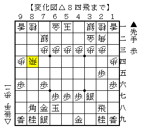 △8四飛の局面は先手が1歩損ですが、後手が手損なのでどうかという局面です。