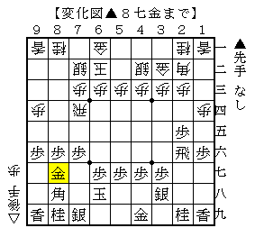 この手順の▲7七角は数手前に▲8六角と出ているので手損になるのですが、単なる手待ちでなく狙いのある手です。