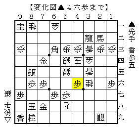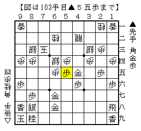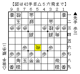 後手は△5四銀としていいタイミングで△6五歩とか△4六歩で暴れてくる狙いです。
