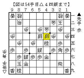 上図は、居飛車対振り飛車の対抗形からの進展で△5四銀と上がった局面。ソフトの評価値+46で互角。