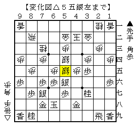 この手順は▲5五角と打って角のラインで後手の攻めをけん制する手で、以下△8三飛から銀交換になります。