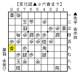 ▲9六香に△9二香打なら、▲3二歩成△9五香▲同香△同香▲5三歩成△同銀▲同桂成△同金▲9二金△1一飛▲9三銀で、ソフトの評価値+1685で先手優勢。
