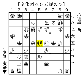 △5五銀以下▲7七桂△9二角で、ソフトの評価値-53で互角。