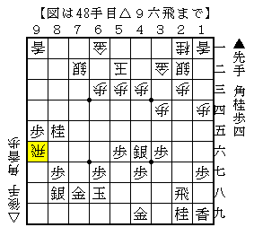 後手は飛車と桂馬の攻めですが結構うるさい攻めで、△9八角とか△9七歩とか△7七歩とか△7六飛などたくさんの狙いがあります。