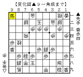 ▲9一角成に△9七歩なら▲9二馬△7五飛▲7六歩△同飛▲6五馬△9六飛▲8五桂△9八歩成▲7九銀で、ソフトの評価値+186で互角。
