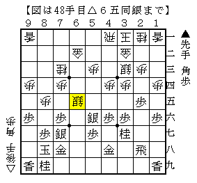 この手順は、▲6四歩と垂らして次に▲6三歩成△同金▲5二角を狙った手で、後手は△6一飛と受けますがそこで▲2九飛と△3九銀の割打ちの銀を防いでいい勝負のようでした。